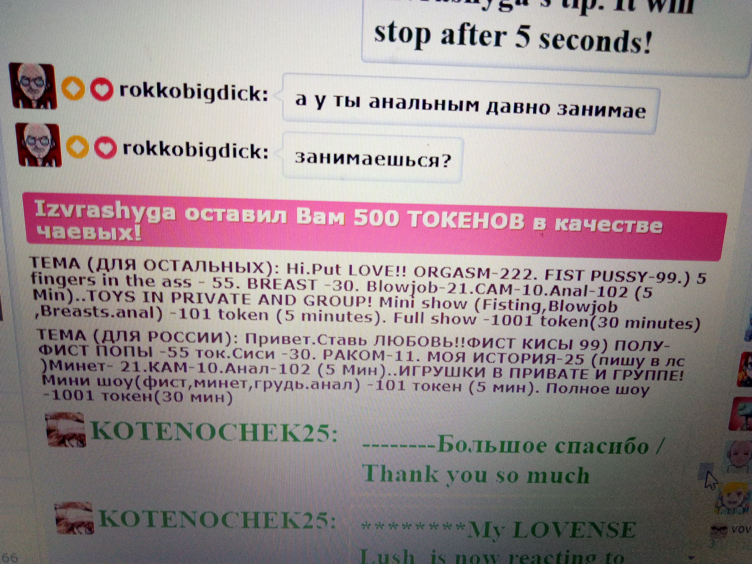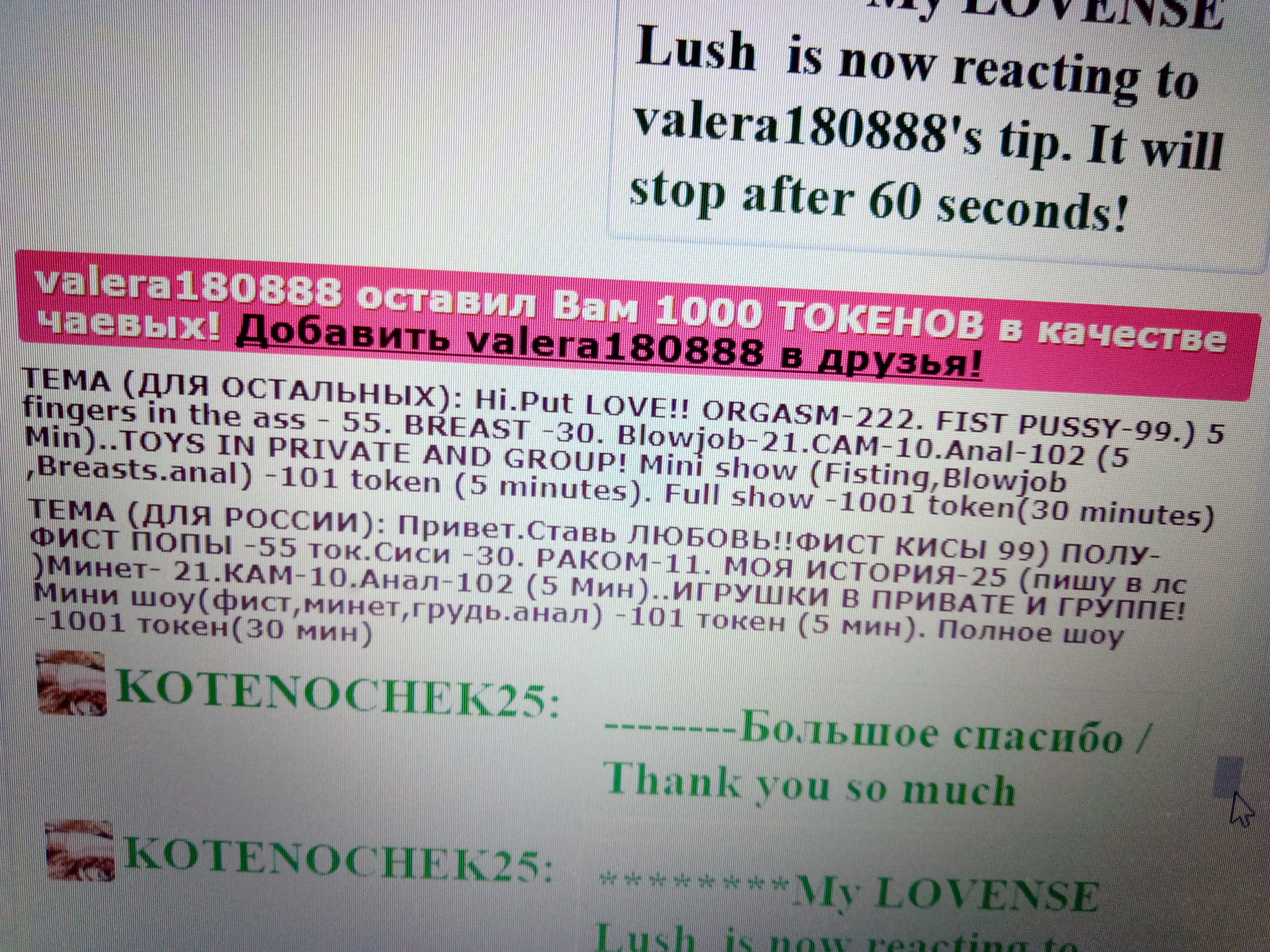 Ved at klikke på knappen, vil løfte KOTENOCHEK27 til første position på forsiden i 60 sekunder. I denne periode vil din models chatrum blive meget mere synlig og utrolig populær! En notifikation vil blive vist i chatten, som både modellen og andre brugere kan se – og de vil være meget taknemmelige.